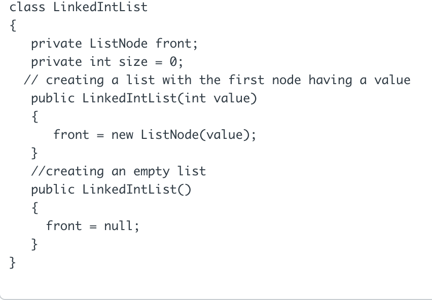Methods involved in Java ListNode. I created a LList2 class to store the first and last n. 4 steps process The new node is always added before the head of the given Linked List.